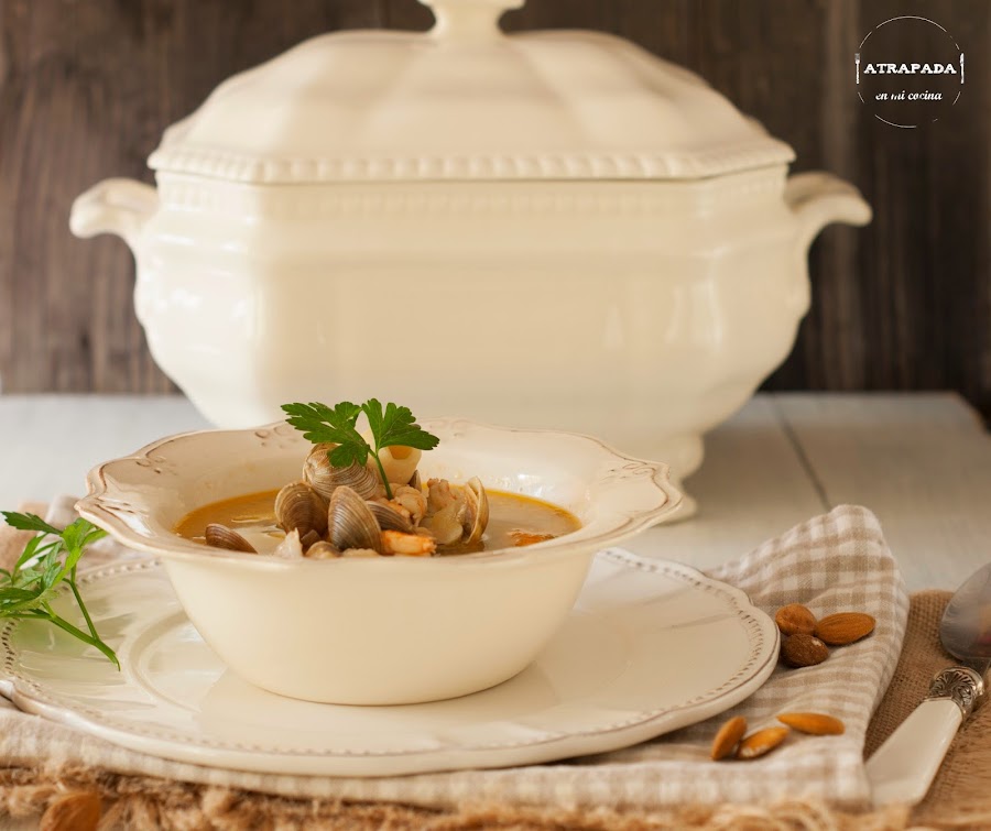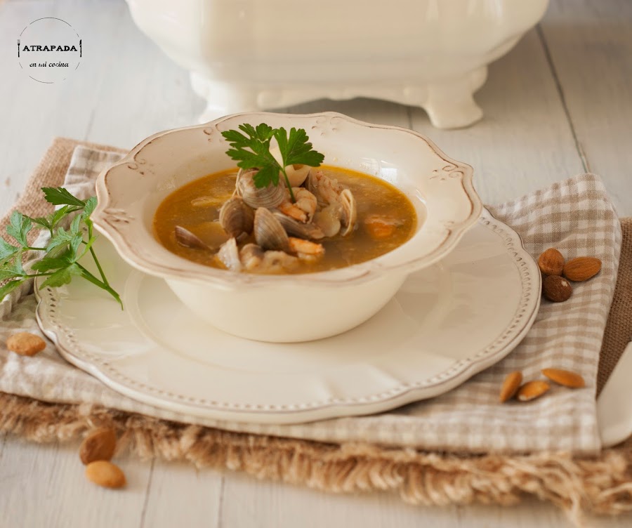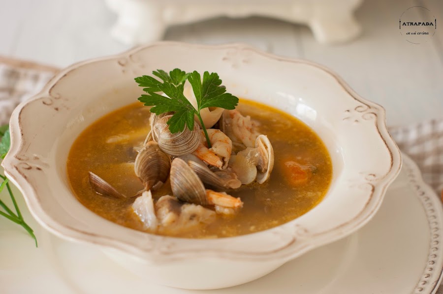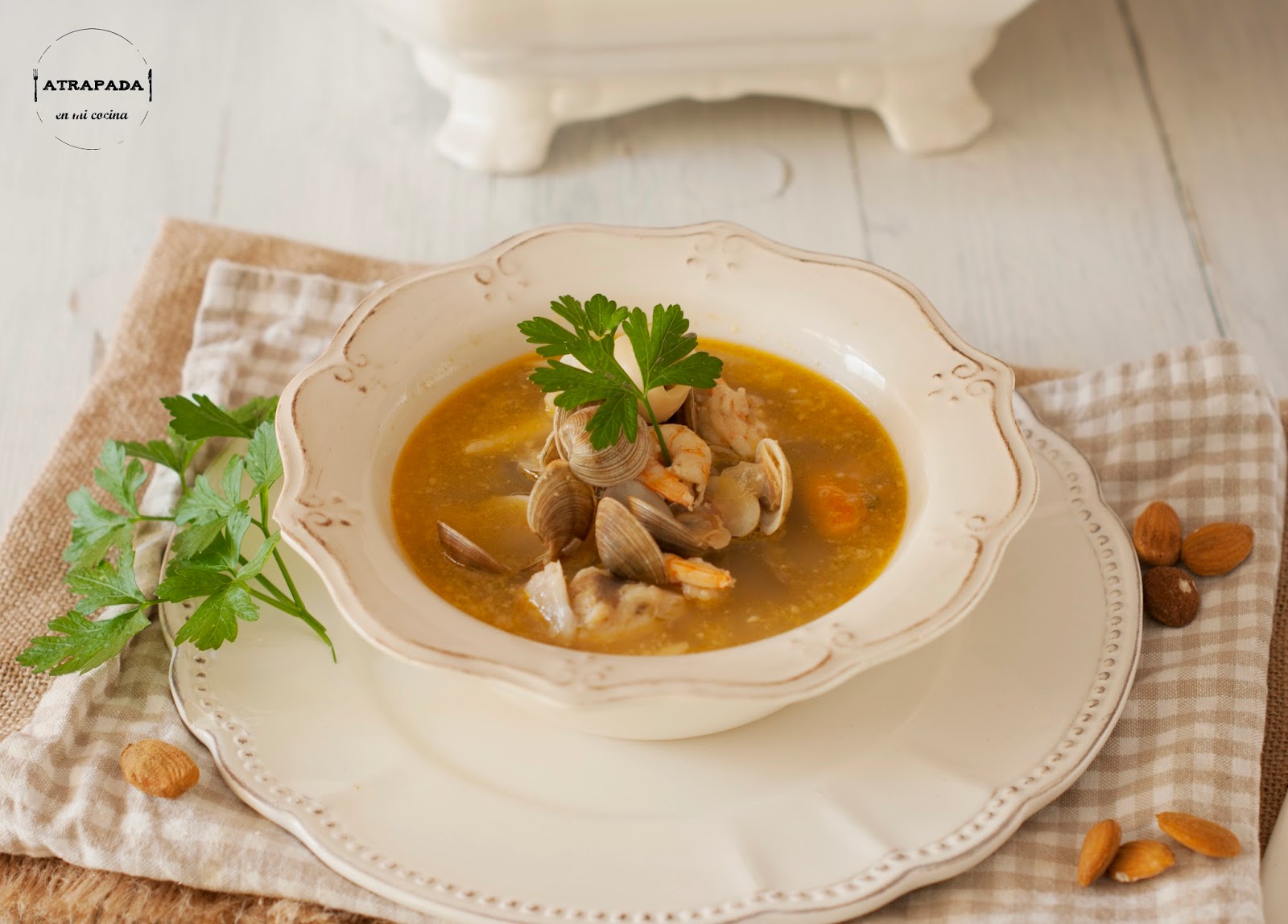 Cuatro años y medio de blog y aún no había publicado esta receta. Una receta básica de nuestra cocina y que viene perfecta como entrante de cualquiera de las comidas navideñas que se aproximan. Pese a llevar marisco no resulta excesivamente cara, es una sopa de marisco más bien humilde, asequible a la mayoría de los bolsillos. Si queréis hacerla más festiva, y os lo podéis permitir, podéis añadirle cigalas, carabineros, etc....Así tal cual como os la traigo yo está muy buena y seguro que os gusta a todos en casa.