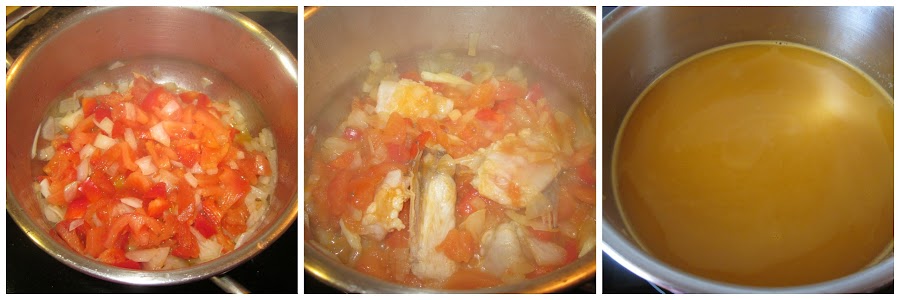 Añadimos esta mezcla al sofrito y ponemos las espinas del rape.