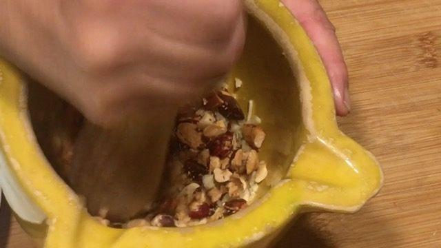 Hacemos un majado con dos dientes de ajo cortados que machacaremos, añadiremos las avellanas y almendras tostadas sin piel y seguimos machacando. Añadiremos el perejil y picamos todo con la mano del mortero. Reservamos