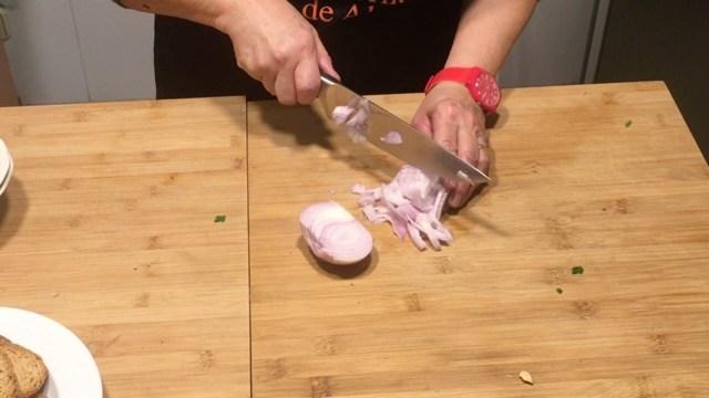 Picamos la cebolla y pelamos el tomate que también cortaremos en trocitos pequeños.