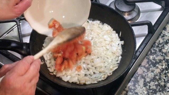 Sofreímos la cebolla en una sartén con aceite de oliva y cuando empiece a transparentar añadiremos el tomate y sofreiremos todo junto unos 10 minutos con el fuego muy bajo.