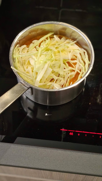 Echamos el caldo y removemos y dejamos calentar 1 minuto. Ahora echamos todos los demás ingredientes, las patatas cortadas en cuadrados pequeños, el repollo cortado en juliana y las setas cortadas por la mitad.