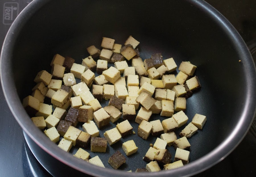 Se pone al fuego la olla/cazo/sartén donde vayáis a preparar la sopa y un pelín de aceite, añadimos los daditos de tofu y los dejamos dorar durante unos minutos. Mientras tanto podemos ir lavando, pelando y cortando el resto de verduras. Una vez que el Tofu está dorado, retiramos de la olla y reservamos.