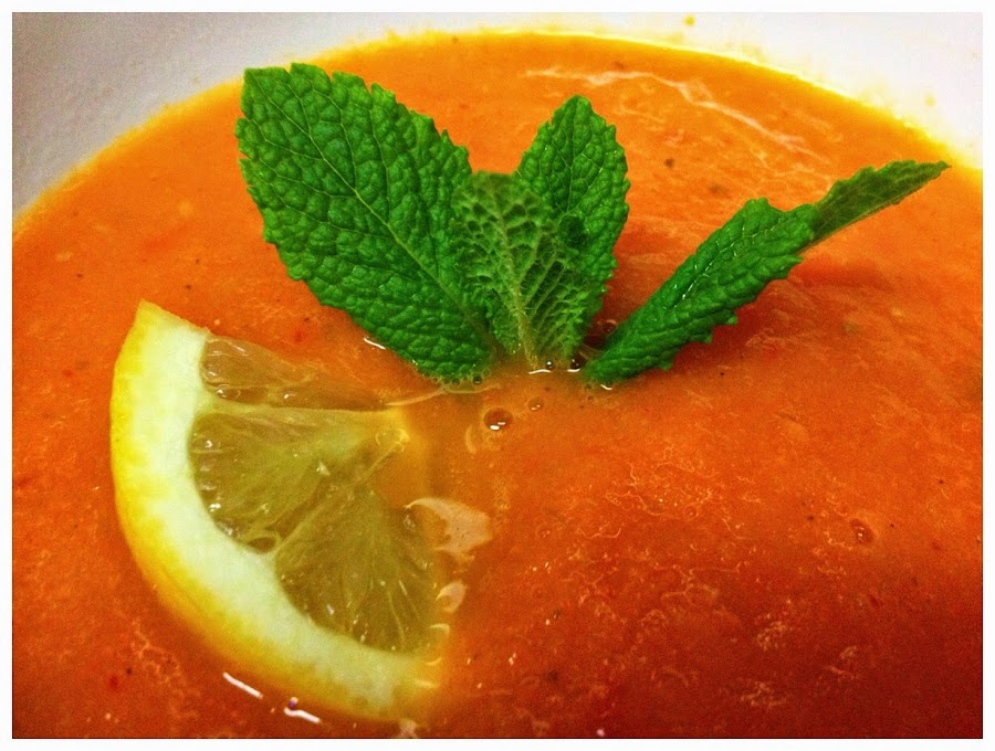 Añadimos los tomates y el agua caliente. El jengibre, la hierbabuena y salpimentamos al gusto.