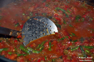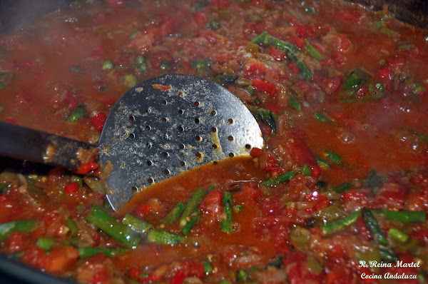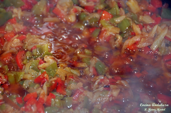 Hacemos un refrito con los ajos, la cebolla y los pimientos; todo picadito. Cuando todo esté pochado le incorporamos el tomate natural, machacándolo con la paletilla hasta que esté frito.