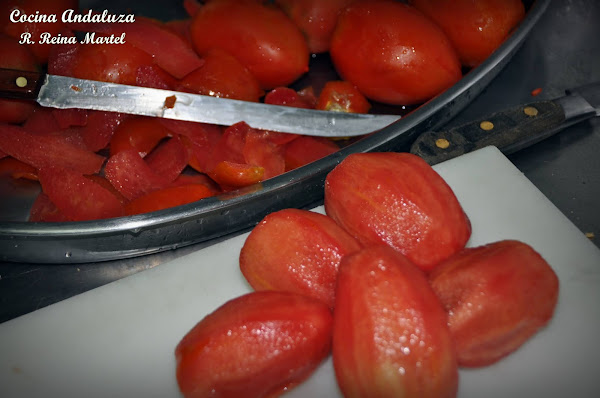 Escalfamos en agua los tomates, vertiéndolos, justo cuando el agua esté a punto de hervor durante unos segundos para poder pelarlos a posteriori con facilidad.