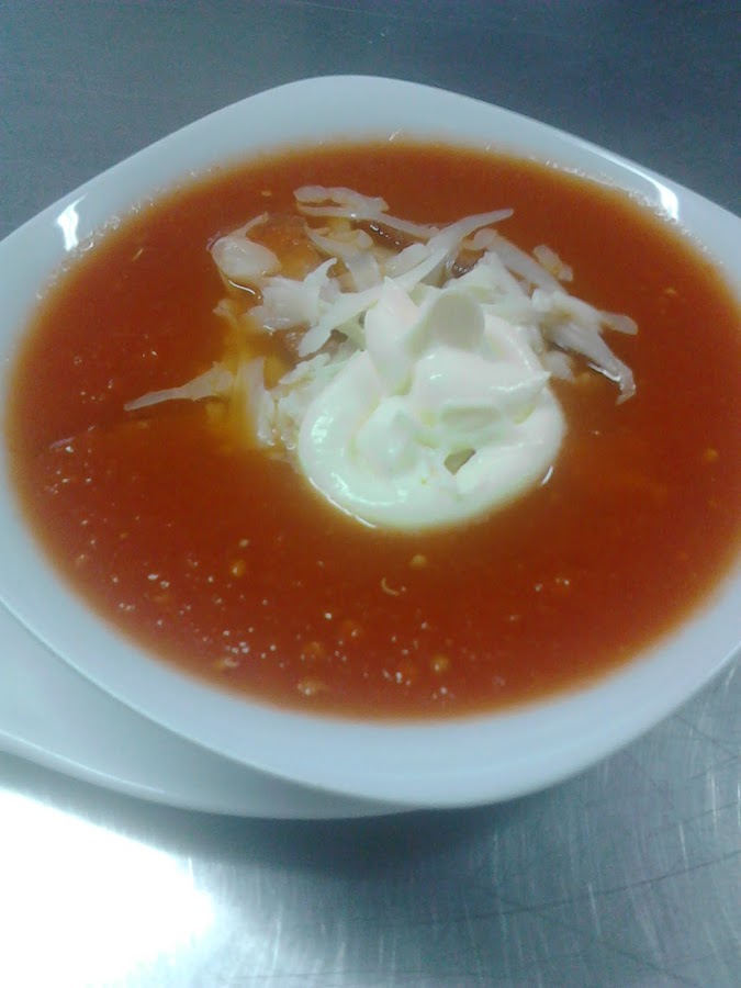 Licuar el tomate,una parte del caldo de pollo, azúcar,cebolla,chile,ajo verter a la olla dejar hervir,luego agregar el tabasco,pasta de tomate,resto del caldo de pollo,sal y pimienta dejar hervir 12 minutos más,para servir la sopa acompañar con queso parmesano rallado,natilla o crema ácida y tostadas pan con ajo.