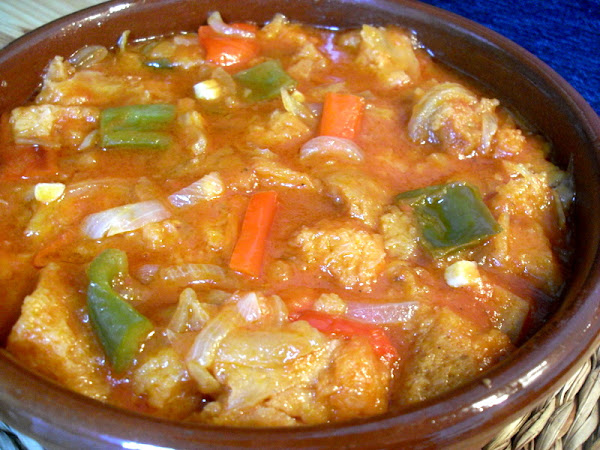 Elaboración:Se pelan y se pican las cebollas en juliana. Se pelan y pican finamente 2 dientes de ajos. Los otros 2 se pelan y se reservan para el majado. Se lavan los pimientos, se secan y se cortan en trozos. Trocear los tomates maduros.