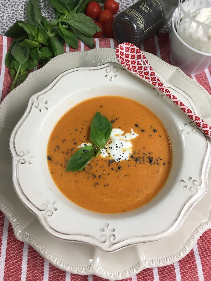 En la receta de hoy os lo traigo en forma de sopa o crema, con un puntito de albahaca que le eleva y hace que sea un bocado exquisito. Si os resulta un poco ácida la sopa, siempre podéis añadir una pizca de sal para compensar.