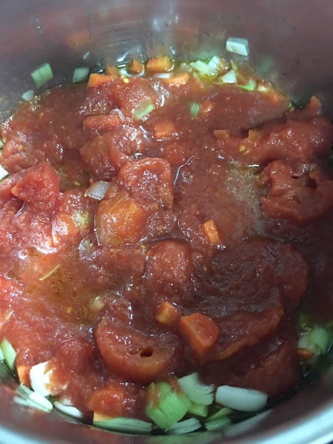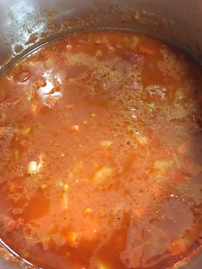 Se incorpora el caldo de pollo, el resto del agua de vegetación del tomate en conserva, se salpimenta y se deja cocer 45 minutos.
