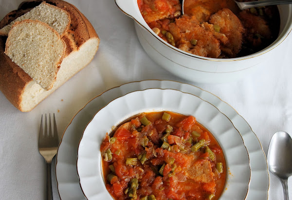 En una cacerola ponemos el aceite a calentar, cuando esté templado echamos los ajos sofriendo un minuto, echar la cebolla un par de minutos, añadimos el pimiento, comino majado y el laurel. Dejamos que sofrían removiendo de vez en cuando. Pasado cinco minutos echamos el tomate. Mientras sofreímos las hortalizas pondremos el fuego a temperatura media-baja. Después de poner el tomate lo bajamos a fuego lento y cuando esté frito añadimos el agua. Dejamos hervir a fuego medio durante 15 minutos y añadimos sal. En una sartén aparte ponemos el aceite restante y salteamos los espárragos con ajo muy picado dejándolos al dente. Mientras tanto cortamos el pan en rodajas finitas. Una vez pasado el tiempo de cocción de las verduras ponemos los espárragos y el pan y dejamos reposar unos minutos antes de servir.