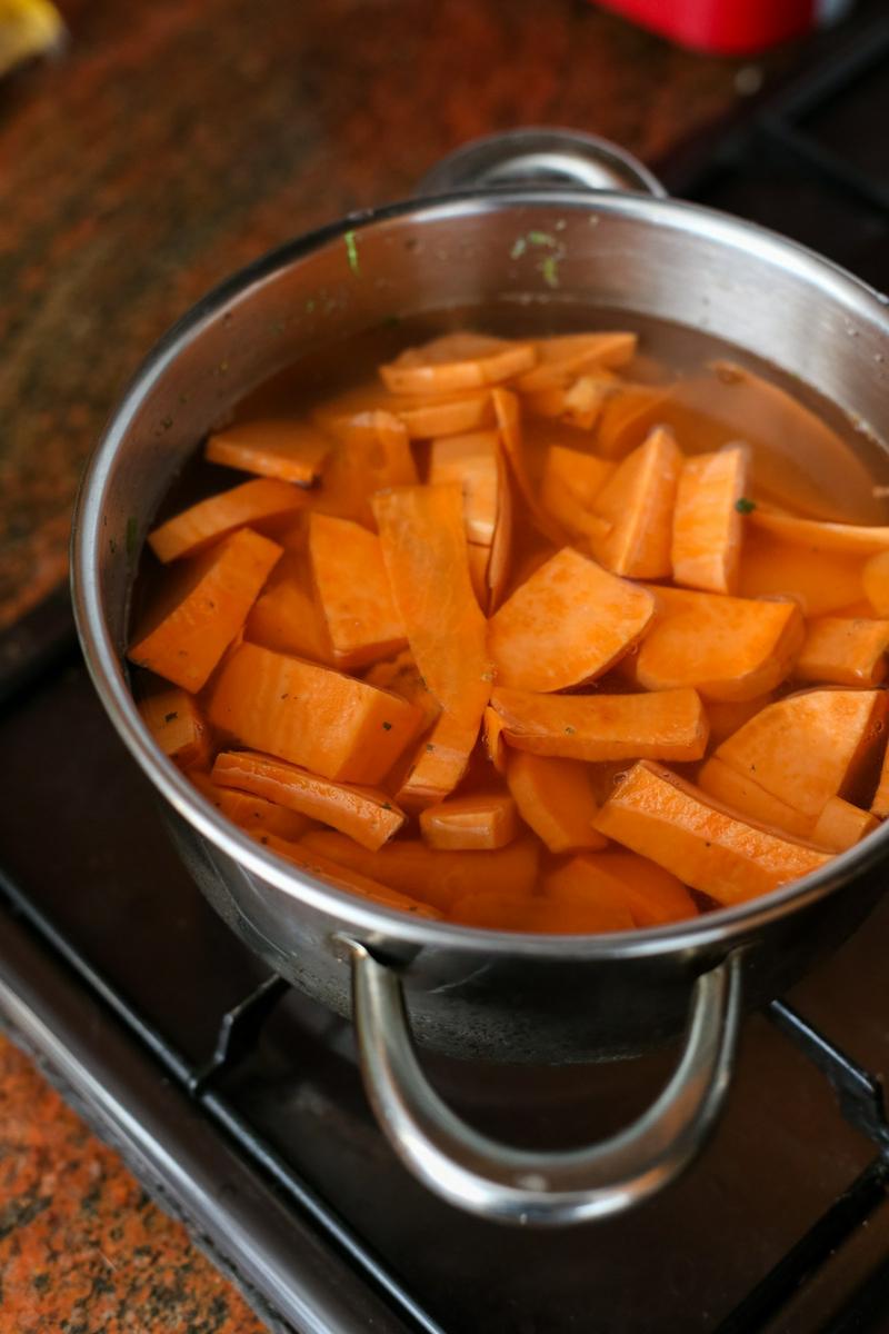 Pelar y cortar en trozos pequeños el camote (boniato). Colocar en una olla y añadir 1 litro de caldo (de pollo o verduras). Cocinar durante aprox 15 minutos o hasta que el camote esté blando.