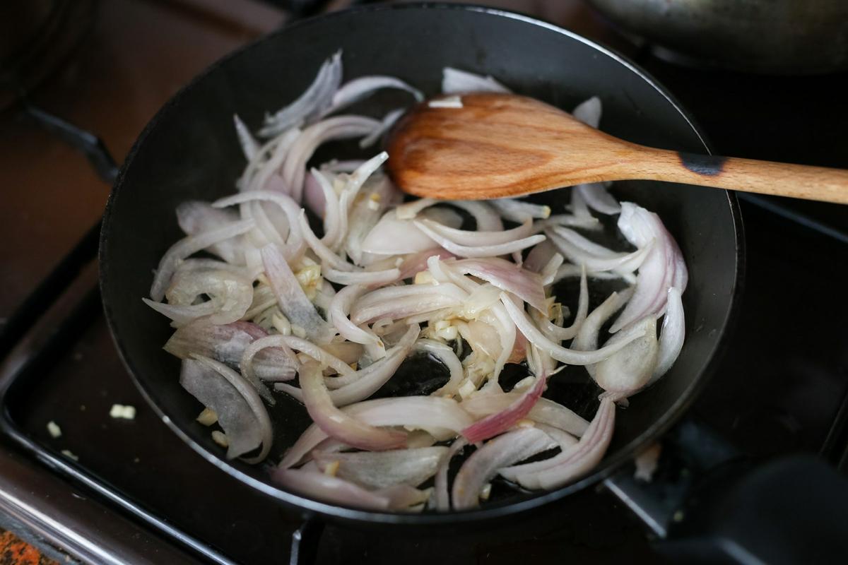 Mientras se cocina el camote, picar la cebolla y el ajo y lo sofreír en un sartén con una cucharada de aceite durante un par de minutos o hasta que la cebolla esté tierna. Reservar.