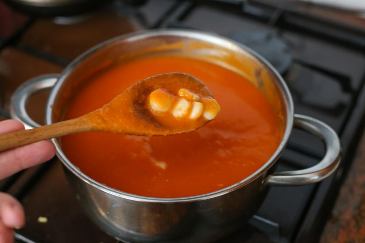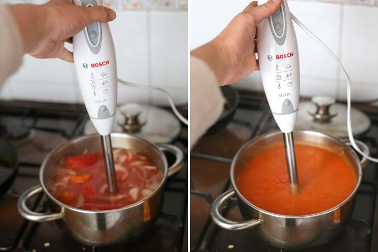 Sacar la olla del fuego y agregar los tomates enteros pelados, 2 cucharaditas de sal y una pizca de pimienta. Añadir también la cebolla y el ajo sofritos, el jalapeño (o similar) y triturar toda la mezcla (yo uso una trituradora de mano para hacerlo en la misma olla, pero también puedes hacerlo en una licuadora o juguera). Triturar hasta obtener una sopa con textura cremosa (puedes dejar algunos trocitos sin licuar para darle más textura)
