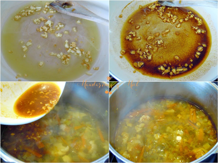 Cuando las verduras estén casi cocidas, echa en la cazuela el sofrito de ajo y pimentón y remueve. Si te ha quedado algo del sofrito en la sartén, recógelo echando un poco del caldo en la sartén y volviéndolo a tirar en la olla.