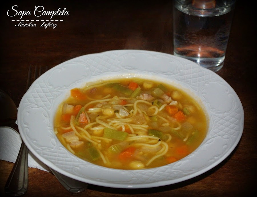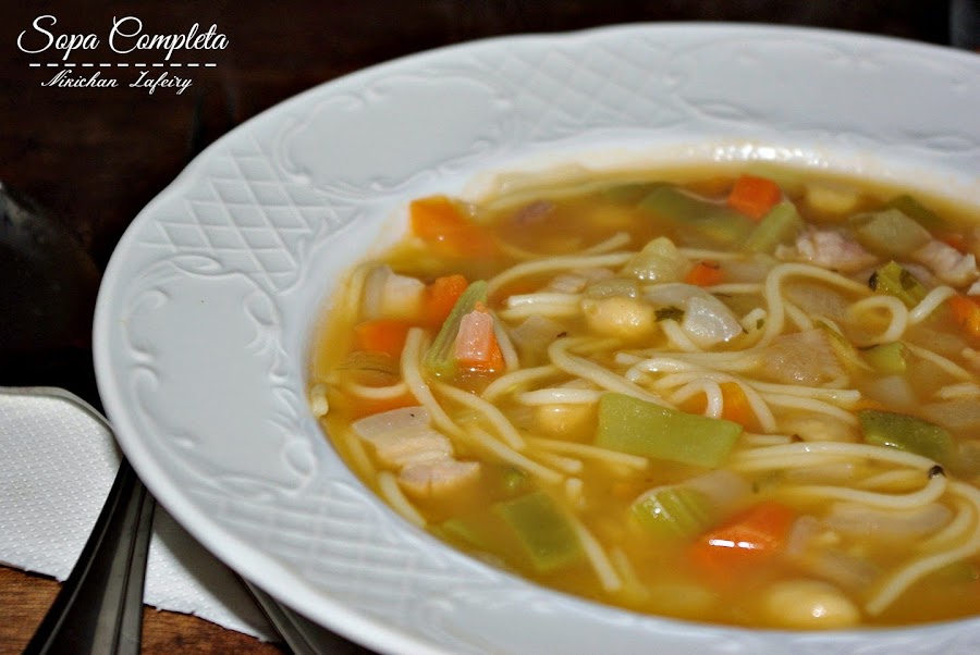 Hoy vamos a preparar una sopa muy completa que bien podría ser perfectamente plato único. Nosotros la preparamos como primer plato, sirviendo poca cantidad para no llenarnos mucho.