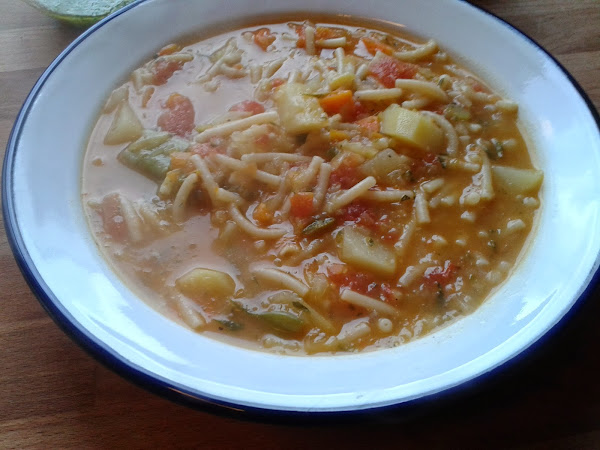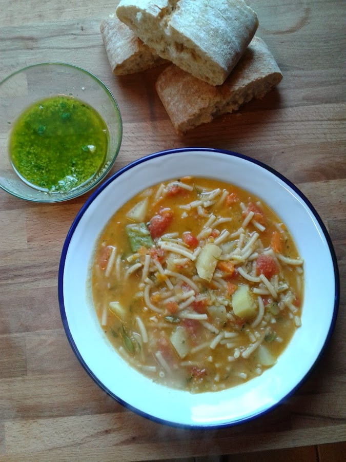 Calienta el aceite en una olla grande, saltea el ajo, la cebolla, el apio y la zanahoria unos minutos, removiendo con frecuencia. Añade el caldo, el tomate, las judías y las patatas. Salpimienta. Lleva la sopa a ebullición. Incorpora el ramillete de albahaca. Baja el fuego y tapa la olla, deja que hierva unos 15 minutos. Incorpora las habas si las tuvieras, el calabacín y la pasta y deja cocer otros 10 minutos, hasta que las hortalizas y la pasta esté tierna. Rectifica de sal si fuera necesario. Desecha el ramillete de albahaca.