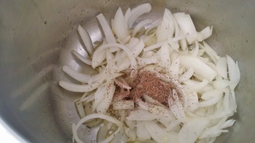 - En una olla, ponemos el aceite de oliva a fuego medio e incorporamos la cebolla, los dientes de ajo pelados y machacados y el tomillo.