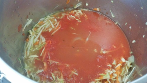 - Incorporamos a la olla el tomate triturado, el caldo de pollo y las verduras ralladas.