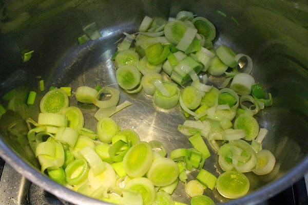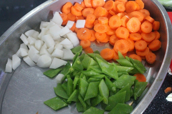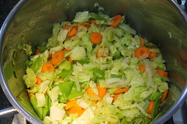 Ponemos en una olla al fuego un poco de aceite de oliva virgen, añadimos los puerros cortados en rodajas y los sofreímos un poco, a continuación añadimos la col picada en juliana, la removemos e incorporamos las zanahorias, los nabos y los tirabeques. Removemos bien.