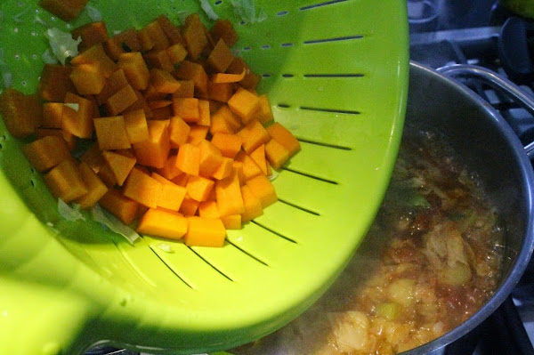 Incorporar el agua hirviendo y dejamos que se cuezan un poco todas las verduras que tenemos en la olla. A los 5 minutos añadimos la calabaza.