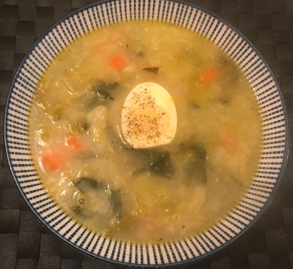 En la cazuela/olla donde vayas a cocer la verdura pon a calentar el aceite y rehoga el ajo y el jamón, mientras corta todas las verduras en dados, incluyelas en la cazuela y dale unas vueltas para que se pochen ligeramente, añade agua o caldo y el huevo y deja hervir unos 20-25 minutos, quita el huevo y enfríalo, sirve la sopa con medio huevo en el centro espolvoreado con un poco de pimienta molida y listo para servir.