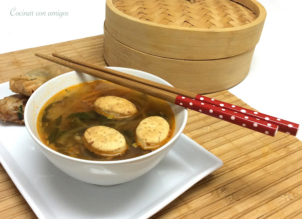 Cocinamos durante 15 minutos, incorporamos las gambas y cuando cambien de color podremos servir la sopa de verduras Thai en un cuenco.