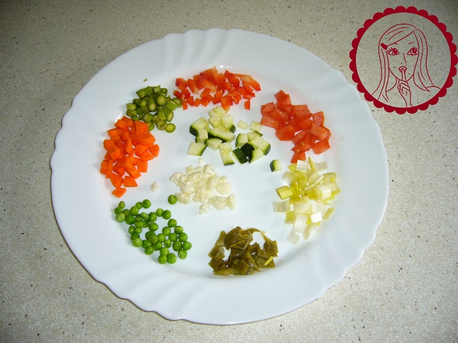 Preparación:Troceamos todas las verduras en pequeños cubitos. Ponemos una olla con un par de