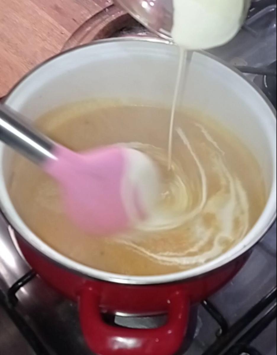 Mixear todo ( puré con el caldo con el jamón con la pimienta)y añadir la crema.