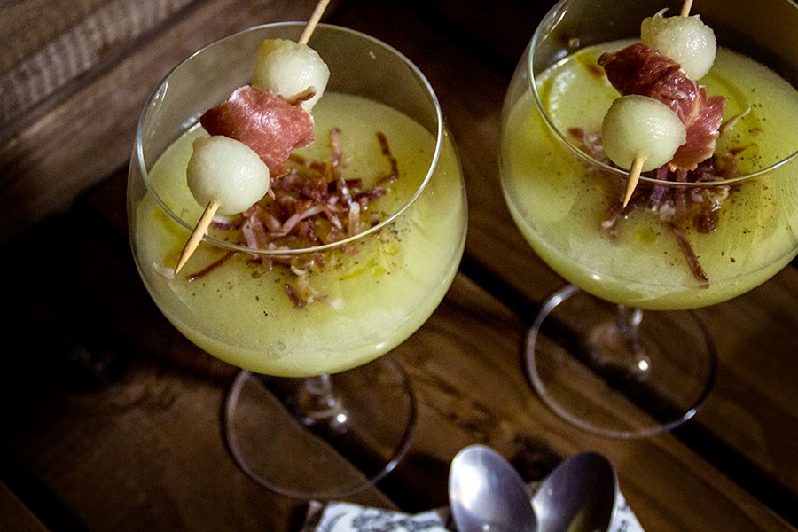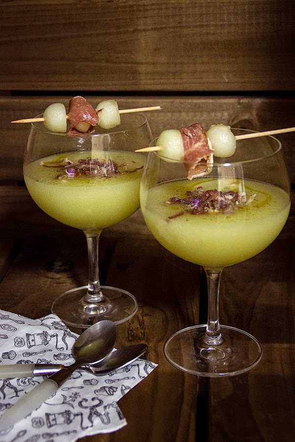 Metemos el melón en dados en el vaso de la batidora y hacemos un puré fino que luego pasaremos por el chino para eliminar cualquier fibra. Probamos y salpimentamos al gusto, teniendo en cuenta que luego le añadiremos jamón. Metemos en la nevera para que esté bien fresquito.