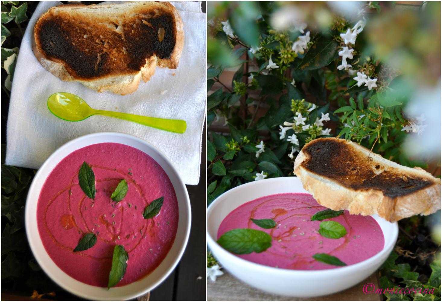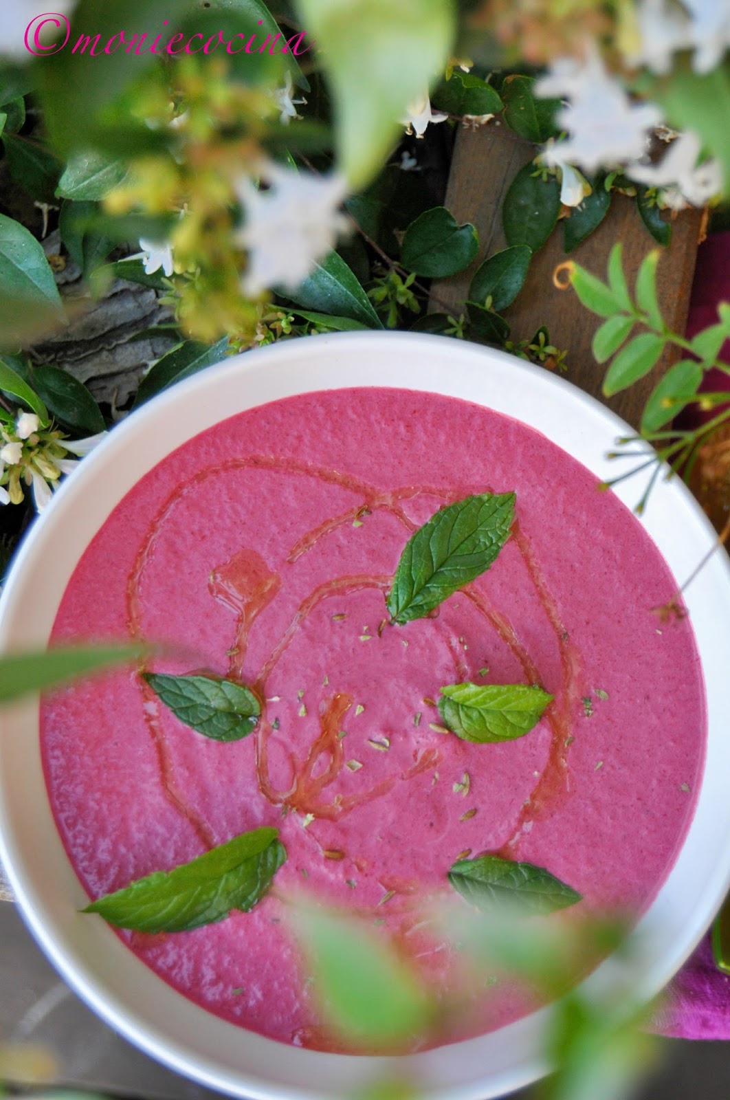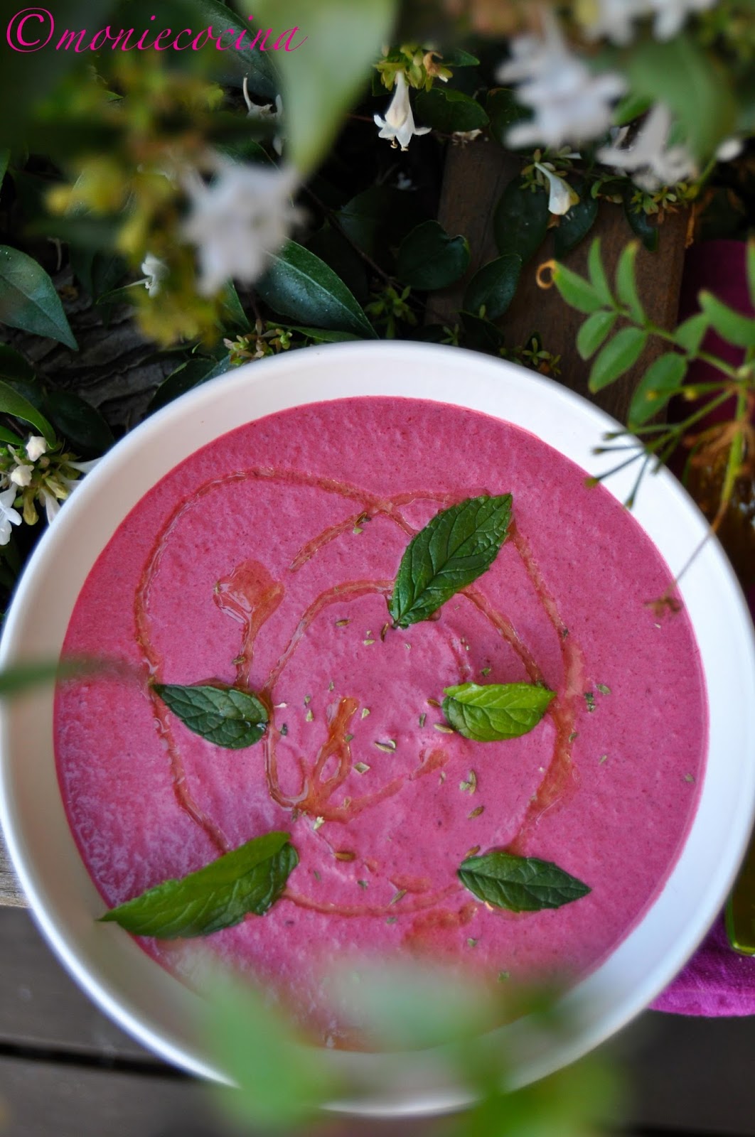 La preparación es sencilla, ponemos en el vaso de la batidora las remolachas cortadas en trocitos, los yogures, yo usé griegos por su cremosidad, pero da igual cualquier yogur natural sin azúcar añadido. Una cucharada de aceite de oliva, unos pocos cominos, la medida de "pizca" yo creo que es muy española y que me entendéis si digo una pizca de cominos, porque una cucharadita, la teaspoon americana quizás sea mucho sabor. Pero esto al gusto. Y por último sal y pimienta recién molida.