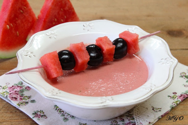 5. Llevamos a la nevera para que esté bien fría en el momento de servir. Decoramos cada plato con una brocheta en la que se alternen trozos de sandía y cerezas.