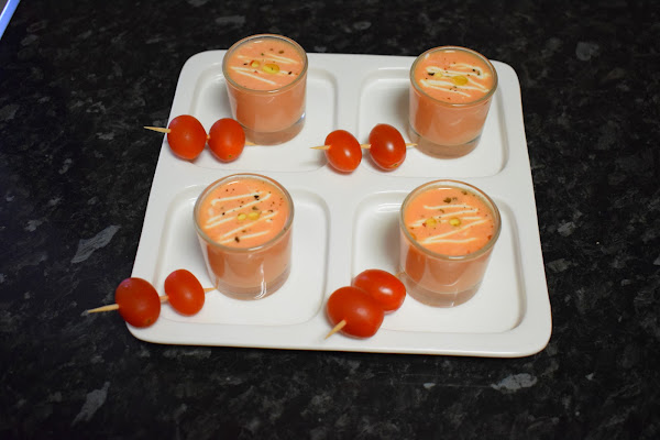 Verter la sopa en unos vasos de chupito y decorar con un poco de yogur, una pizca de pimienta y unas gotitas de aceite de oliva.