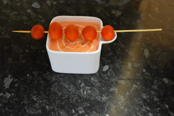 Vertemos la sopa en unos boles que no sean muy grandes, y decoraremos de la misma forma que los chupitos. En este caso cogeremos una brocheta y le pincharemos tomates cherry de pera, ponemos la brocheta encima del bol.