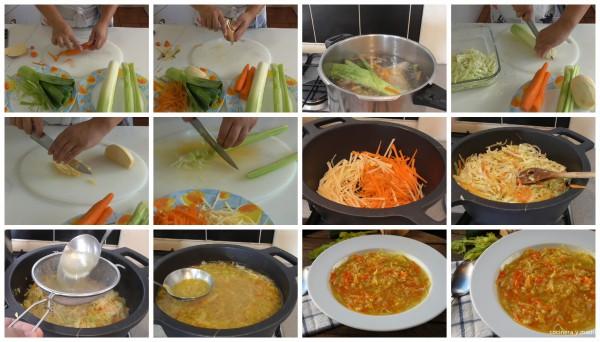 Mientras se hace el caldo vamos a cortar las verduras; como su propio nombre indica sopa juliana casera tenemos que cortar la verdura el juliana; es decir en bastones finos el apio también (podéis verlo más claro en el vídeo).