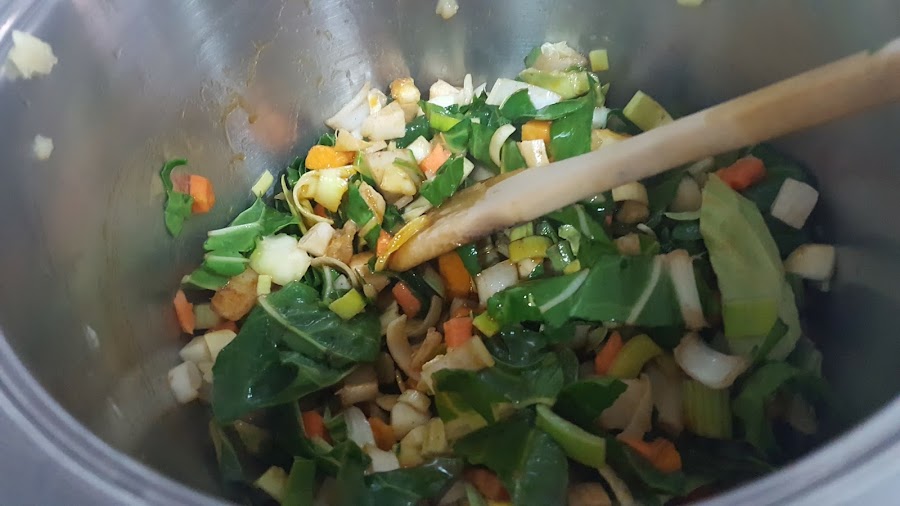 3.- Después echamos la verdura y la salteamos, unos minutos.