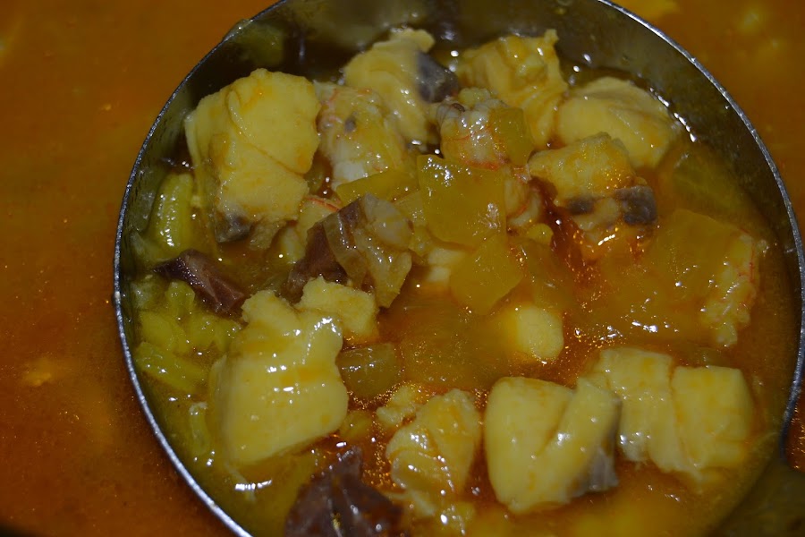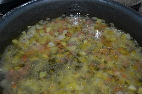A continuación echamos el arroz, el pescado a trozos y las gambas peladas dejamos cocer unos quince o veinte minutos.