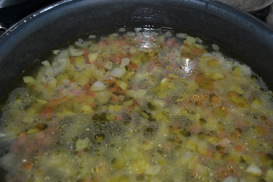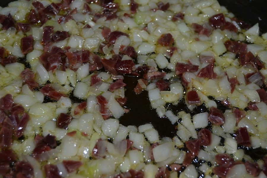 En una cazuela ponemos aceite de oliva y rehogamos la cebolla cortada a trozos pequeñitos y añadimos el jamón y cocinamos un poco.
