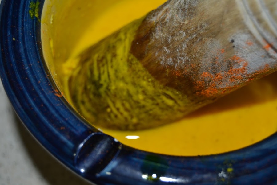 Mientras tanto hacemos un majado con los dientes de ajo, un poco de sal, unas hebras de azafrán, el colorante, las dos yemas de huevo cocidas, y la copa de vino. Añadimos a la cazuela y dejamos que hierva todo.