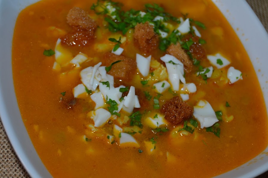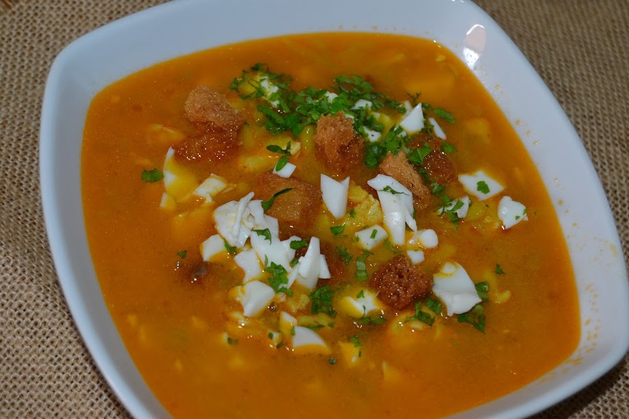 Se le pueden añadir almejas yo en este caso no tenía y no se las eché. Rectificamos de sal, apartamos, dejamos reposar y servimos con picatostes, las claras de los huevos cocidos y perejil.