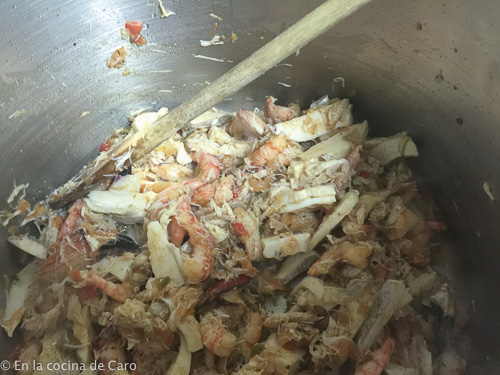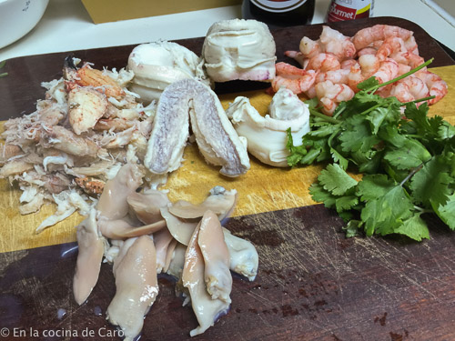 Partiremos de un fumet de pescado, machas limpias, gambas peladas, locos cocidos, jaiba desmenuzada, cilantro.