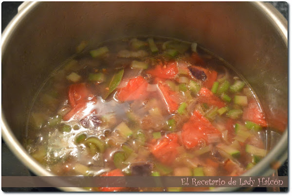 Si no tienes caldo, puedes disolver media pastilla de caldo de pollo en 1,5 litros de agua o añadir directamente solo el agua en la olla, hasta cubrir todas las verduras. Añade la hoja de laurel y el tomate troceado y remueve. Lleva a ebullición y ponlo a fuego lento.