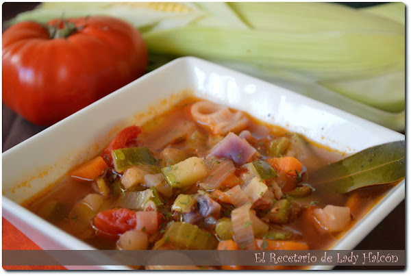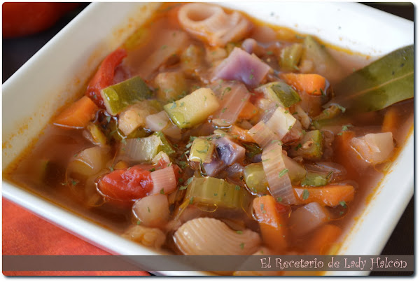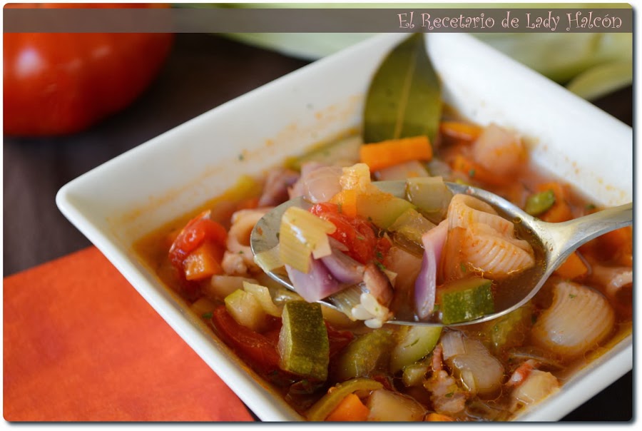 Y esta sopa minestrone era una de las recetas que teníamos en nuestra lista de improbables. Bueno, rectifico, estaba incluida en mi lista de recetas a no probar... ¿Por qué? Pues no sabría muy bien explicar el por qué, pero es oir sopa de verduras y automáticamente me cierro en banda: no me gusta. Yo disfruto con la sopa y con las verduras, pero por separado. Cuando me las juntas me convierto en una acérrima Mafalda jaja.