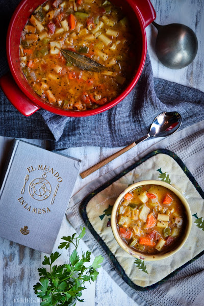 Una sopa copiosa a la vez que simple y económica en la que también se pueden aprovechar restos de comidas previas para hacer un plato bien completo. Es también una buena receta de aprovechamiento, en la que utilizaremos hasta el agua de cocción de la pasta como parte del caldo.