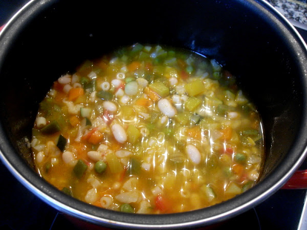 Poner el bouquet de hierbas e incorporar el caldo de verduras, añadir las judías verdes, los guisantes, la corteza de queso Parmigiano Reggiano y dejar cocer 30 minutos tapado. Incorporar las patatas y la coliflor y cocer 30 minutos. Seguidamente echar el calabacín y el tomate, dejar cocer todo 30 minutos más, sazonar, añadir más caldo o agua. Por último añadir las judías blancas cocidas, la pasta y las hojas picadas de albahaca, dejar cocer 10 minutos. Quitar la corteza de Parmigiano y el bouquet de hierbas. Retirar del fuego y dejar reposar 5 minutos.