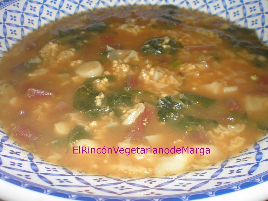 Ponemos a calentar un litro de caldo vegetal, hasta que hierva, vamos preparando las verduras. En un vaso con 3/4 de agua, disolvemos bienel trozo de miso y se lo añadimos al caldo. Pelamos la remolacha y la cortamos a daditos, troceamos a rodajas el puerro y picamos el repollo. Cuando hierva el caldo, añadimos los daditos de remolacha, el repollo y el puerro y dejamos cocer unos 5 minutos; pasado ese tiempo, añadimos el mijo pelado y el puñado de espinacas frescas. Cocemos 12 minutos más. Añadimos curry y pimienta y servimos bien calentito.
