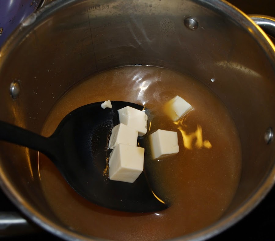 - Una vez integrada la pasta miso en el caldo, añadimos el tofu previamente cortado en cubitos y removemos. Hacedlo con cuidado, ya que este tipo de tofu es más blandito y por ello más frágil, y se os puede romper.