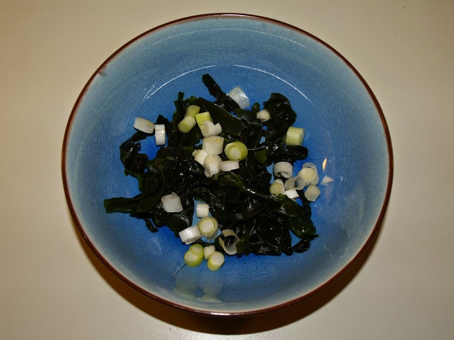 - Cuando estén listas las algas, las escurrimos bien y las ponemos una cantidad al gusto junto con cebolleta cortada en rodajas finas en el fondo de un bol o plato sopero.