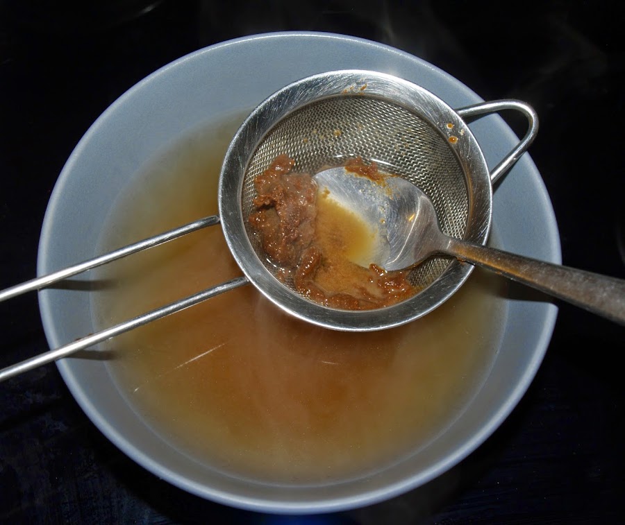 - A continuación añadimos la pasta miso. Para ello os recomiendo hacerlo de la siguiente manera: Vertemos parte del caldo en un bol. En un colador ponemos una cucharada de miso y lo ponemos en contacto con el caldo. Con ayuda de una cuchara vamos integrando la pasta en el caldo. Existen diversas variedades de miso: rojo, blanco, etc... que varían en sabor e intensidad. También puede variar bastante de una marca a otra, así que os recomiendo que vayáis añadiendo cucharada a cucharada. Devolviendo el caldo a la cacerola cada vez, removiendo y probando antes de añadir más. En principio se añadiría una cucharada de miso por cada taza de agua añadida para el caldo, pero os repito que es mejor que probéis. En mi caso, por ejemplo, solo puse dos cucharadas de miso ya que después de probar la segunda me pareció que el sabor era rico y suficientemente intenso. Más hubiera sido demasiado. Insisto: probad cada vez!