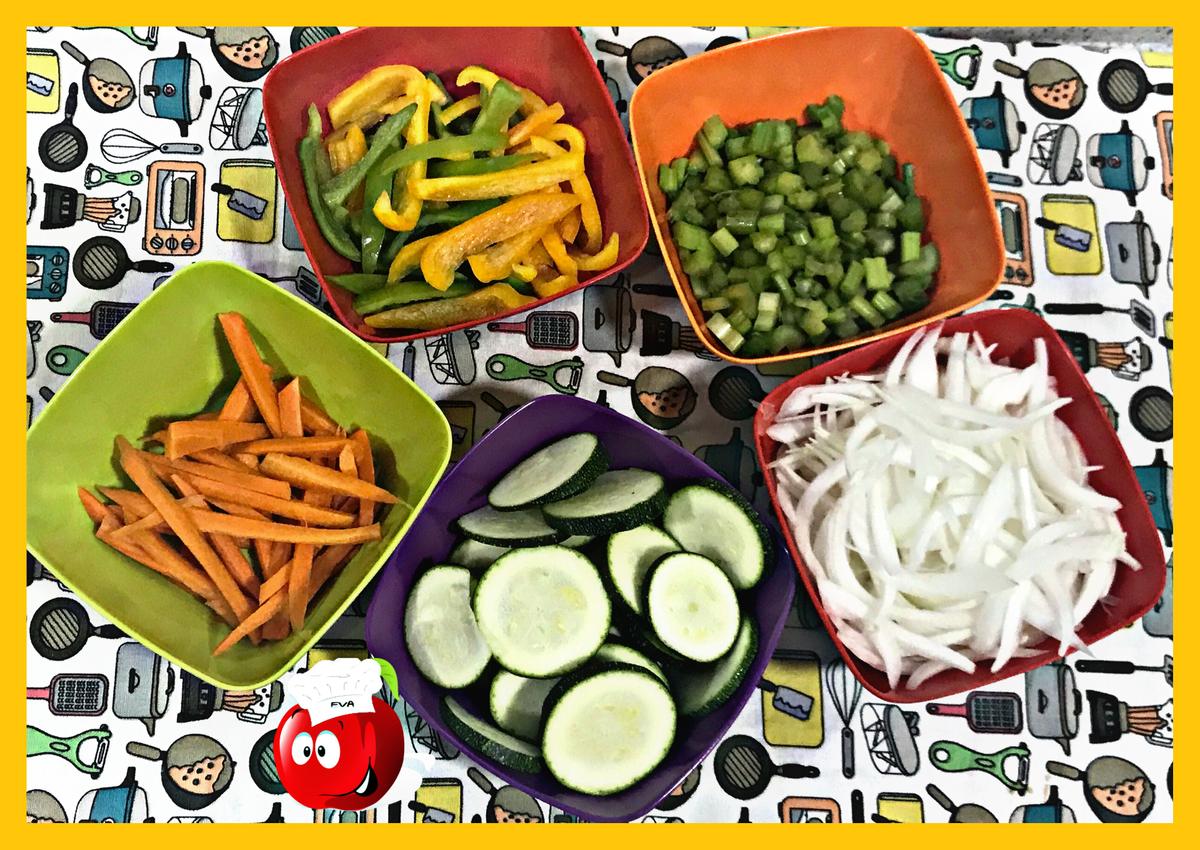 15 minutos—Los pimientos, el calabacín y el apio cortados en trozos.
